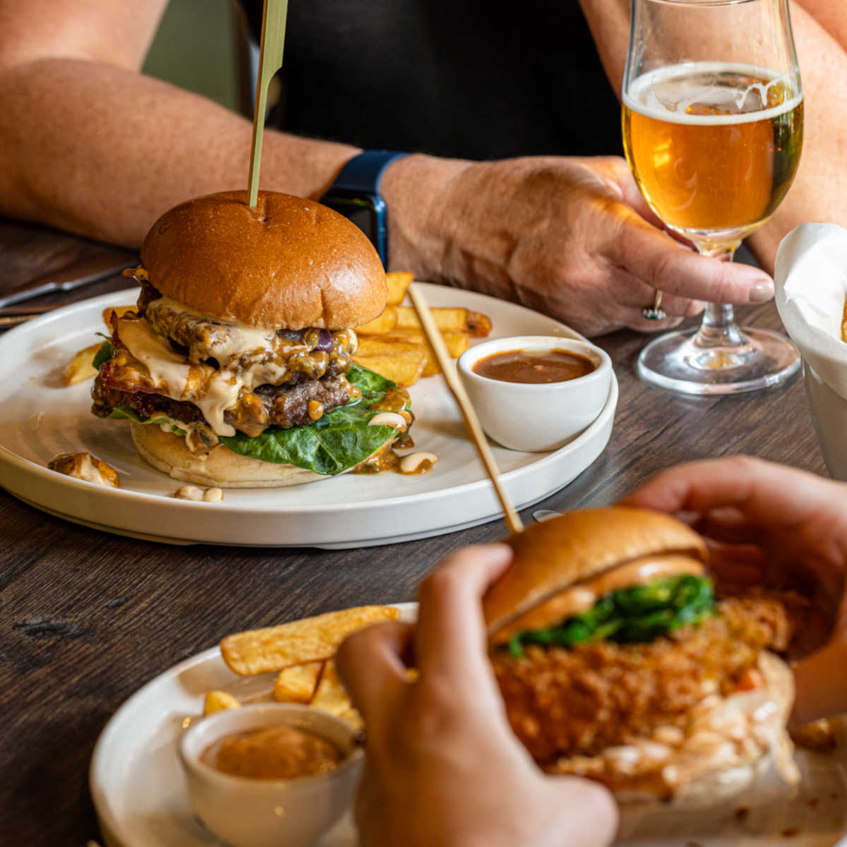 Blacksticks blue cheese, double beef burger, bacon, caramelised red onion, peppercorn mayo, skin-on chips | 20 1328 kcals
