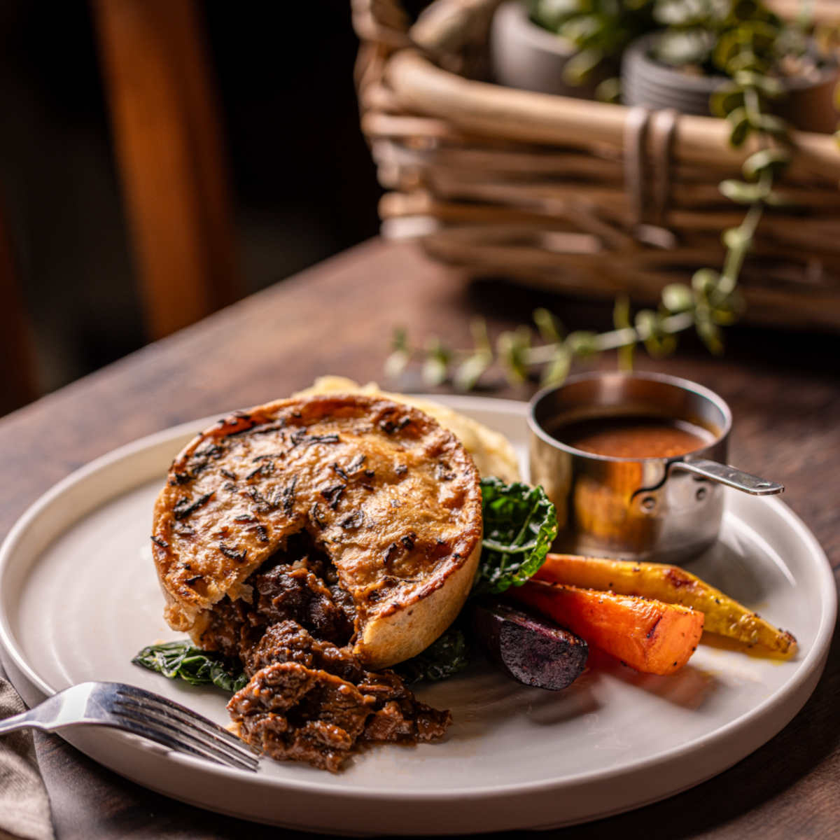 British steak & ale pie, mash, roasted roots, buttered cavolo nero | 18.5 1107 kcals