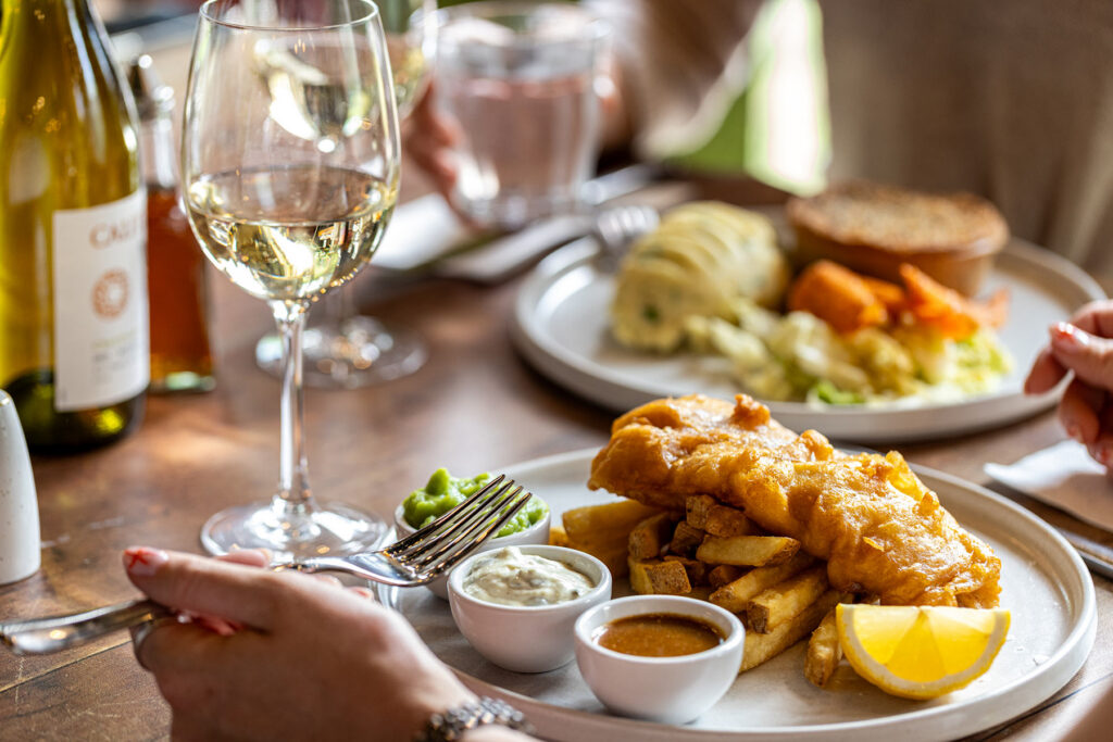 Beer-battered fish & chips, minted mushy peas, homemade tartare, curry sauce | 19.5 1657 kcals
