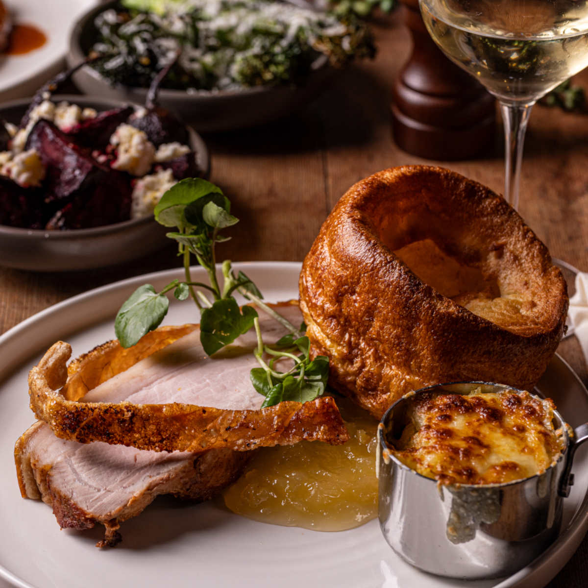 All served with roast potatoes, seasonal greens, roasted roots, Yorkshire pudding, beef dripping gravy